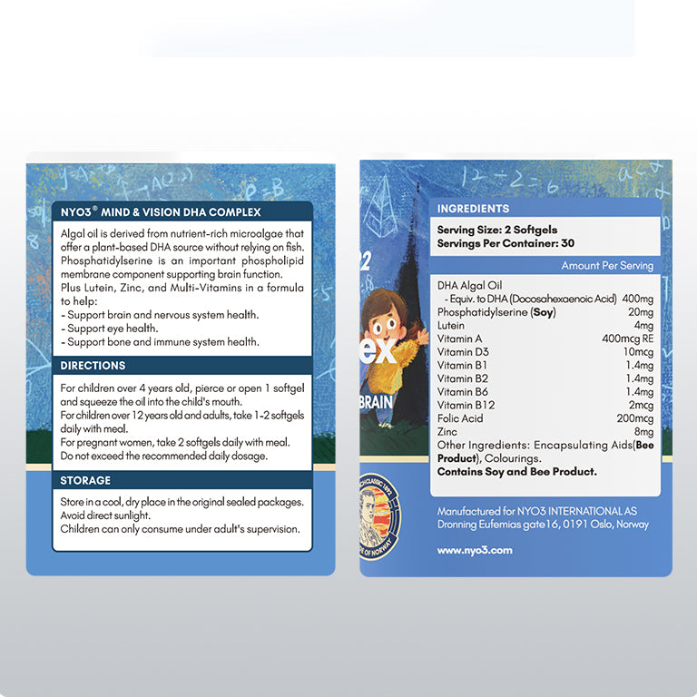 NYO3® CLASSIC 1892 Mind & Vision DHA Complex is a premium plant-based DHA formula designed to support brain development, memory, focus, and eye health. It combines Algal DHA, Phosphatidylserine (PS), Lutein, and 11 essential vitamins & minerals to provide comprehensive cognitive and visual support for students, adults, and seniors.